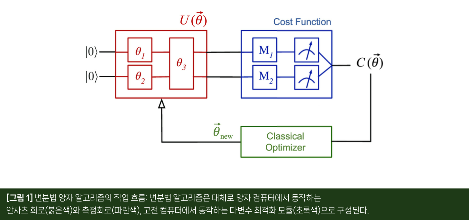 [그림 1]에서 알 수 있듯, 변분법 양자 알고리즘은 양자 컴퓨터에서 구동되는 안사츠(Ansatz) 회로와 측정 회로와 고전 컴퓨터에서 구동되는 다변수 최적화 모듈로 구성된다. 동작 원리도 비교적 간단해서 초깃값으로 주어진 인자들로 구성된 안사츠 회로를 이용해 양자 컴퓨터에서 계산한 기댓값을 다변수 최적화 모듈의 입력으로 사용하고, 다변수 최적화 모듈에서 얻은 계산한 인자를 이용해 안사츠 회로를 업데이트해 나가는 프로세스를 원하는 답을 얻을 때까지 반복하는 것이 전부다. 물론, 풀고자 하는 문제에 맞도록 효율적인 측정 회로와 기댓값 함수를 설계하는 것은 어려운 연구주제이나, 기본적으로 변분법 양자 알고리즘은 '임의의 초기 해를 우리가 원하는 해로 수렴'시켜가는, 고전 컴퓨터에서 많이 사용되는 일반적인 순환 알고리즘(interative algorithm)과 유사한 방식으로 동작한다고 할 수 있다.