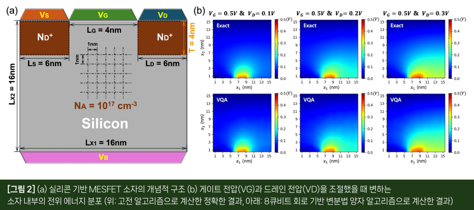 [그림 2]의 (a)는 실리콘 반도체로 이루어진 간단한 MESFET(MEtal-Semiconductor Field Effect Transistor) 소자 구조를 2차원에서 표현한 것으로, 다소 비현실적인 크기를 가정했다(계산에서는 16nm-by-16nm(1nm=10-9m) 크기의 도메인을 사용했지만, 실제 사용되는 MESFET은 마이크로미터(~10-6m) 수준의 크기를 가지기 때문). [그림 2]의 (b)는 MESFET 소자에 인가되는 전압 신호의 크기가 달라질 때 소자 내부에서 어떻게 전위 에너지의 분포가 달라지는지에 대해 푸아송 방정식을 이용해 계산한 결과를 보여주고 있는데, 윗줄 3개의 결과는 고전 알고리즘(LU 분해기법)으로 얻은 정확한 분포를, 아랫줄 3개의 결과는 변분법 양자 알고리즘을 이용해 페니레인(PennyLane) 시뮬레이터로 계산한 분포를 뜻한다. 세 가지의 인가전압에 대해 양자 알고리즘으로 얻은 해의 충실도는 모두 99.97% 이상으로 확인되었으며, 이는 비록 작은 규모이긴 하지만 NISQ 알고리즘으로 푸아송 방정식을 꽤 정확히 풀 수 있음을 시사한다.