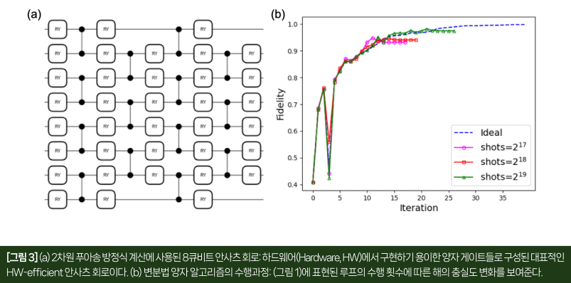 [그림 3]의 (a)는 2차원 푸아송 방정식 문제를 반도체 소자 특성 계산에 적용했을 때 사용한 안사츠 회로를, (b)는 루프의 수행 횟수에 따른 해의 충실도 변화를 측정 횟수의 함수로 보여 준다. (b)의 중요한 두 가지 메시지는 [그림 1]에 표현된 루프의 실행횟수에 따라 해의 충실도가 증가한다는 점과 측정횟수 (shot의 수)가 충분히 많아야 충실한 해를 얻을 수 있다는 점이다. [그림 3]의 결과에서 우리는 ‘고작’ 8큐비트 회로로 표현된 푸아송 방정식의 해를 얻는데 30여 번의 루프 실행과 루프 당 100만 번 이상의 측정이 필요하다는 점을 알 수 있다. 8큐비트 회로로 표현된 푸아송 행렬이 256-by-256이고 이 정도 규모의 선형 시스템을 고전 컴퓨터에서 매트랩(MATrix LABoratory, MATLAB) 같은 소프트웨어로 계산하면 1초도 걸리지 않는다는 점을 생각한다면, 적어도 변분법 양자 알고리즘이 고전 수치 알고리즘 대비 효율성이 좋다고 말할 수 없다는 점은 너무나도 분명해 보인다.