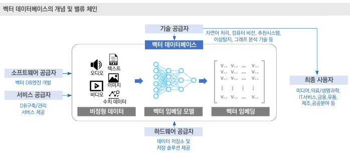 벡터 데이터베이스는 텍스트, 이미지, 오디오 등 비정형 데이터의 특징을 수치화한 ‘벡터 임베딩’으로 저장해 기존 방식보다 훨씬 정확하고 의미적인 검색 결과를 제공하는 차세대 데이터베이스이다. 벡터 데이터베이스는 기존 전통적인 데이터베이스의 색인 기능이 아닌 의미적 유사도 기반의 정보 검색을 목적으로 하기 때문에 사용자의 의도를 가장 잘 이해하고 원하는 결과를 제공해 줄 수 있는 추천 시스템에서 활용도가 높아서 실제로 넷플릭스, 유튜브, 스포티파이, 틱톡, 디즈니+ 등 스트리밍 서비스에서 개인화 추천을 위해 활용되고 있다. 향후 로봇·자율 주행 시장의 확대, 바이오·헬스케어 분야에서의 인공지능(AI) 도입 가속화는 벡터 데이터베이스 시장의 성장을 촉진할 것으로 예상된다. 벡터 데이터베이스의 밸류체인은 소프트웨어 공급자, 서비스 공급자, 기술 공급자, 하드웨어 공급자, 최종 사용자로 구성된다.