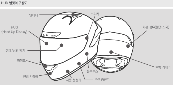 HUD(Head-Up Display) 헬멧은 이륜 자동차(또는 오토바이) 운전자가 교통사고 발생 시 머리를 보호하거나 내비게이션, 위험 안내 등의 정보를 제공하는 안전용품이다. 주요 부품으로는 외부의 충격에서 머리를 보호하고 피부와의 접촉에서 촉감이 뛰어나면서 방풍, 방수, 방습 등에 적합한 고기능성 소재로 구성되는 헬멧과 운행 정보나 주변 환경 정보를 시각적 정보로 가공해 운전자의 한쪽 눈(단안식)이나 양쪽 눈(양안식) 을 통해 영상을 맨눈으로 직접 볼 수 있는 투과형 디스플레이, 그리고 현실 세계 영상과 혼합하는 AR(Augmented Reality)로 볼 수 있는 비투과형 디스플레이를 들 수 있다. 그리고 HUD 헬멧은 운행 정보나 주변 환경 정보를 수집할 수 있는 전후방 카메라, 속도 센서, 위험 감지 센서 등을 통해 수집된 정보를 분석, 처리, 제공하는 제어부, 각종 전장품을 동작할 수 있도록 배터리를 통해 전원을 공급하는 전원부로 구성되어 있다.