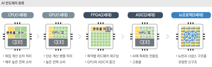 일반적으로 AI 반도체는 아키텍처 구조 및 기술유형에 따라 GPU, FPGA, ASIC 및 뉴로모픽 반도체 등으로 분류되는데, 특히 2세대인 AI 주문형 반도체(Application Specific Integrated Circuit, AI ASIC)는 일반적인 마이크로프로세서나 메모리와 같은 표준 칩과 달리 특정 용도를 위해 제작된 주문형 반도체로서 주로 휴대폰, 네트워킹 장비, 자동차, 의료 기기와 같은 성능, 효율성, 크기, 전력 소비, 보안에 대한 엄격한 요구 사항을 가진 응용 분야에 사용되고 있다.