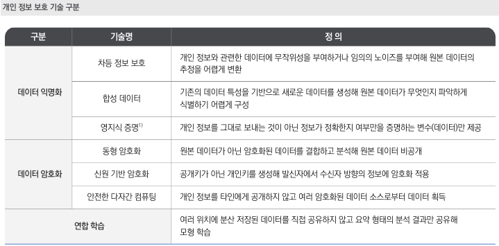 최근 온라인 서비스나 모바일 애플리케이션을 활용하는 사용자의 개인 정보가 유출되었다는 기사가 급증하고 있다. 개인 정보 유출을 막기 위해서 연구되고 있는 다양한 형태의 개인 정보 강화기술(Privacy Enhancing Technology, PET)은 특정 개인 정보나 데이터 보호 기능을 달성하기 위해서 개인 정보를 외부 위협으로부터 보호하기 위한 기술이나 방법 등을 일컫는 말로 OECD에 따르면, 개인 정보 보호를 위해 도입되는 기술로는 데이터 익명화, 데이터 암호화, 연합 학습으로 나누고 있다.