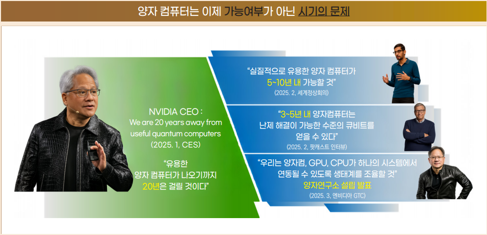 양자 컴퓨팅 기술이 상용화되지 못할 것이라고 말하는 사람은 없다. 특히, 2025년 1월 CES에서 엔비디아의 젠슨 황 CEO가 “양자 컴퓨팅은 아직 멀었다”는 취지의 발언을 했다가, 불과 두 달 뒤 이를 철회하고 오히려 자사의 양자 컴퓨팅 투자 계획을 공식 발표한 사건은 매우 상징적이다. 양자기술은 ‘언제’ 그리고 ‘어떻게’ 산업에 적용할지를 본격적으로 고민하는 단계에 들어섰다.