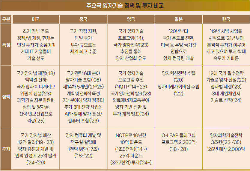다소 늦게 투자에 나선 우리나라는 2019년 양자 컴퓨팅 시범사업을 시작으로 원천기술 개발, 인재 양성, 인프라 구축에 집중해왔다. 2025년에는 예타 수준 대형 사업인 ‘양자 플래그십 사업’을 통해 핵심 기술을 빠르게 확보할 계획이 다. 산업화·상용화로 이어질 후속 단계의 투자가 필요한 시점이다.