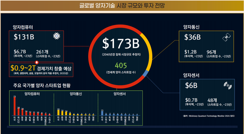 이러한 특성 때문에 양자기술은 자체 시장 규모보다 파급 효과가 훨씬 더 큰 기술로 평가된다. 글로벌 컨설팅사들은 양자 컴퓨팅 시장이 2030년대 초반까지 수십억 달러 규모로 성장할 것으로 전망하지만, 실제 파급효과는 이를 훨씬 상회할 것으로 보인다. 화학·제약 산업에서의 신약 개발 기간 단축, 금융 산업에서의 위험 모델링 혁신 등 산업 전반에서 간접적 경제 효과가 직접 시장 규모를 능가할 것으로 예측되기 때문이다.