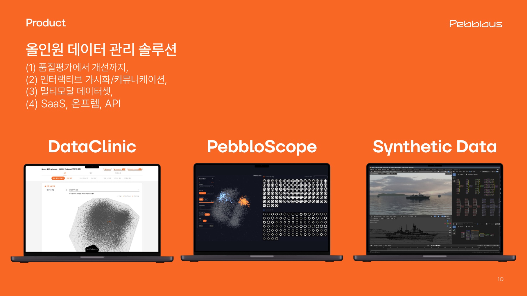 페블러스는 인공지능(AI) 중에서도 데이터를 전문적으로 다루는 회사입니다. AI 시대에는 데이터가 모래알처럼 많다고 이야기하지만, 저희는 창업할 때 모래알 같은 데이터가 아니라 손으로 꼭 잡을 수 있는 단단하고 신뢰할 수 있는 데이터를 고객에게 전달하겠다는 목표를 세웠습니다. 회사 이름 ‘페블러스(Pebblous)’는 모래알처럼 흩어진 데이터가 아니라 손에 잡히는 단단한 조약돌 같은 데이터, 즉 ‘Fabulous+Pebble’을 만들겠다는 뜻을 담고 있습니다.
