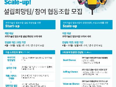 과학기술인협동조합센터에서 '2021 과학기술인 협동조합 설립희망팀 및 운영자 대상 아카데미 과정 및 컨설팅 과정 참가자'를 모집합니다. < 1. 과학기술인 협동조합 교육과정 > * 교육대상 - Start-up : 제한없음 - Scale-up : 과학기술인 협동조합 운영자 * 신청하기 - QR 코드 신청 또는 링크 신청(https://forms.gle/c7FFizzLNqtSc23Y7) < 2. 과학기술인 협동조합 컨설팅 과정 > * 모집대상 - Start-up : 과학기술인 협동조합 설립 희망팀 10개 내외 - Scale-up : 과학기술인 협동조합 10개사 내외 * 신청하기 - QR 코드 신청 또는 링크 신청(https://forms.gle/umW34Hdv6FHmHbF58) 문의하기 ㈜나비프로젝트 김당환 위원 (02-2671-1123) 첨부1. 과학기술인 협동조합 아카데미 과정 웹포스터 첨부2. 과학기술인 협동조합 컨설팅 과정 웹포스터2021 DATA-Stars Camp, DATA-Global 사업 안내 (한국데이터산업진흥원)