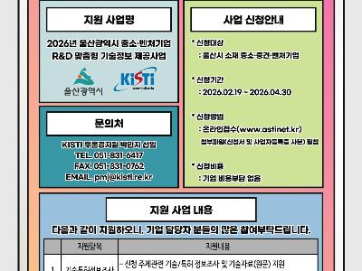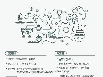 2026년 부산광역시 기업기술정보 지원사업 지원내용 ◾ 기술특허 정보조사 - 신청 주제 관련 기술/특허 정보조사 - KISTI 보유 정보분석시스템 활용 ◾ 핵심 원문 제공 - KISTI 보유 국내외 기술 원문자료 제공 ◾ 특허 산업시장 컨설팅 - 전문가 연계를 통한 맞춤형 심층분석 지원 - 기술, 시장동향, 데이터분석 등 컨설팅 지원 - 기업 R&D 간 수요 기술 관련 동향 ◾ 해외시장 정보분석 - 신청 주제 관련 시장 규모/업체 동향 분석 - 해외 및 신사업 진출에 필요한 정보 제공 신청대상 부산광역시 소재 중소·중견기업 신청기간 ~2026년 4월 30일(목)까지 신청방법 온라인 접수(링크), 본 게시글 첨부파일 및 사업자등록증 사본 필첨 문의 한국과학기술정보연구원 부산울산경남지원 박민지(☎051-831-6417)[공지] [부산울산경남지원] 2026년 울산광역시 중소·벤처기업 R&D 맞춤형 기술정보 제공사업 참여기업 모집