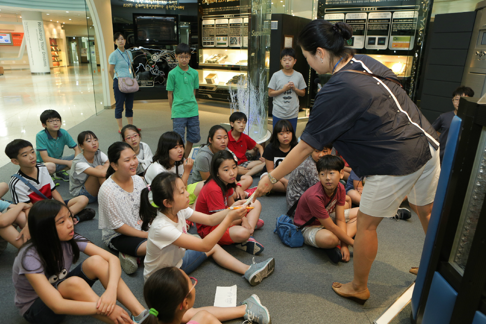 KISTI 연구성과물 투어를 하며 퀴즈를 맞춘 학생은 연구소에서 준비한 선물도 받으며 즐거워 보이는 반석초 학생들입니다.