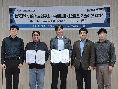 KISTI, 하이브리드 양자암호통신 기술 민간 이전… 포스트 퀀텀 시대 대비한다 - ㈜ 트렌토 시스템즈와 기술이전 협약 체결 - 양자키분배·양자내성암호 결합한 차세대 보안 기술 상용화 □ 한국과학기술정보연구원(원장 이식, 이하 KISTI)은 11월 6일(목) 차세대 네트워크 및 보안 솔루션 전문기업인 ㈜ 트렌토 시스템즈(대표 김영재)와 ‘하이브리드 양자암호통신 서비스 키 관리 및 제공 기술’에 대한 기술이전 협약을 체결했다고 밝혔다. □ 이번에 이전되는 기술은 KISTI가 자체 개발한 핵심 보안 기술로, ‘양자키분배 네트워크 제어장치 및 자원 운용 방법(출원번호 10-2022-0168616)’, ‘단말 및 하이브리드 양자 안전 암호화 지원 방법(출원번호 10-2023-0153376)’ 등 관련 국내 특허 출원이 완료된 상태다. □ 본 기술은 양자키분배(QKD), 양자내성암호(PQC), 그리고 현행 암호기술을 결합한 하이브리드 보안 프레임워크를 기반으로 한다. 특히 한정된 양자키 자원만으로도 파생키 기반 양자키 확장 시스템을 통해 서로 다른 보안 수준을 요구하는 다수의 양자암호통신 서비스를 안정적이고 원활하게 제공할 수 있다는 점이 특징이다. □ 또한 개별 서비스가 아닌 5G 슬라이스, 자율주행 네트워킹 등 다양한 요구사항을 가진 다수의 서비스를 효율적으로 동시에 지원하기 위한 QKD 네트워크 제어 및 자원 운용 방법을 제공한다. □ KISTI 양자통신연구센터 이원혁 센터장은 “양자암호통신은 양자컴퓨팅 시대를 대비한 차세대 보안 기술로, 정보산업의 패러다임을 바꿀 핵심 분야”라며, “물리적 양자암호통신 기반의 QKD 기술과, 양자시대를 대비하는 새로운 암호체계인 PQC를 결합한 하이브리드 보안 기술은 포스트 퀀텀 시대를 선도할 실질적인 성과”라고 말했다. 이어 “이번 기술이전은 양자통신 기술의 본격적인 활용과 확장을 위한 중요한 발판이 될 것”이라고 덧붙였다. □ ㈜ 트렌토 시스템즈 김영재 대표는 “당사는 5G 슬라이스와 미래 모빌리티 서비스 등 차세대 5G/6G 환경에서 요구되는 통신 보안 기술을 지속적으로 개발해왔다”며, “자사 모빌리티 전용 통신 운영 플랫폼 ‘mONOS’에 QKD·PQC·현행 암호를 결합한 하이브리드 보안 프레임워크를 탑재해 5G/6G 기반 미래모빌리티 서비스의 보안성과 실시간성을 동시에 확보할 계획”이라고 밝혔다. 또한 “2025년 초격차 스타트업 지원프로젝트인 ‘융합형 기술사업화’ 과제에 선정된 만큼, KISTI와의 협력을 강화해 미래 통신보안 시장을 선도해나가겠다”고 말했다.