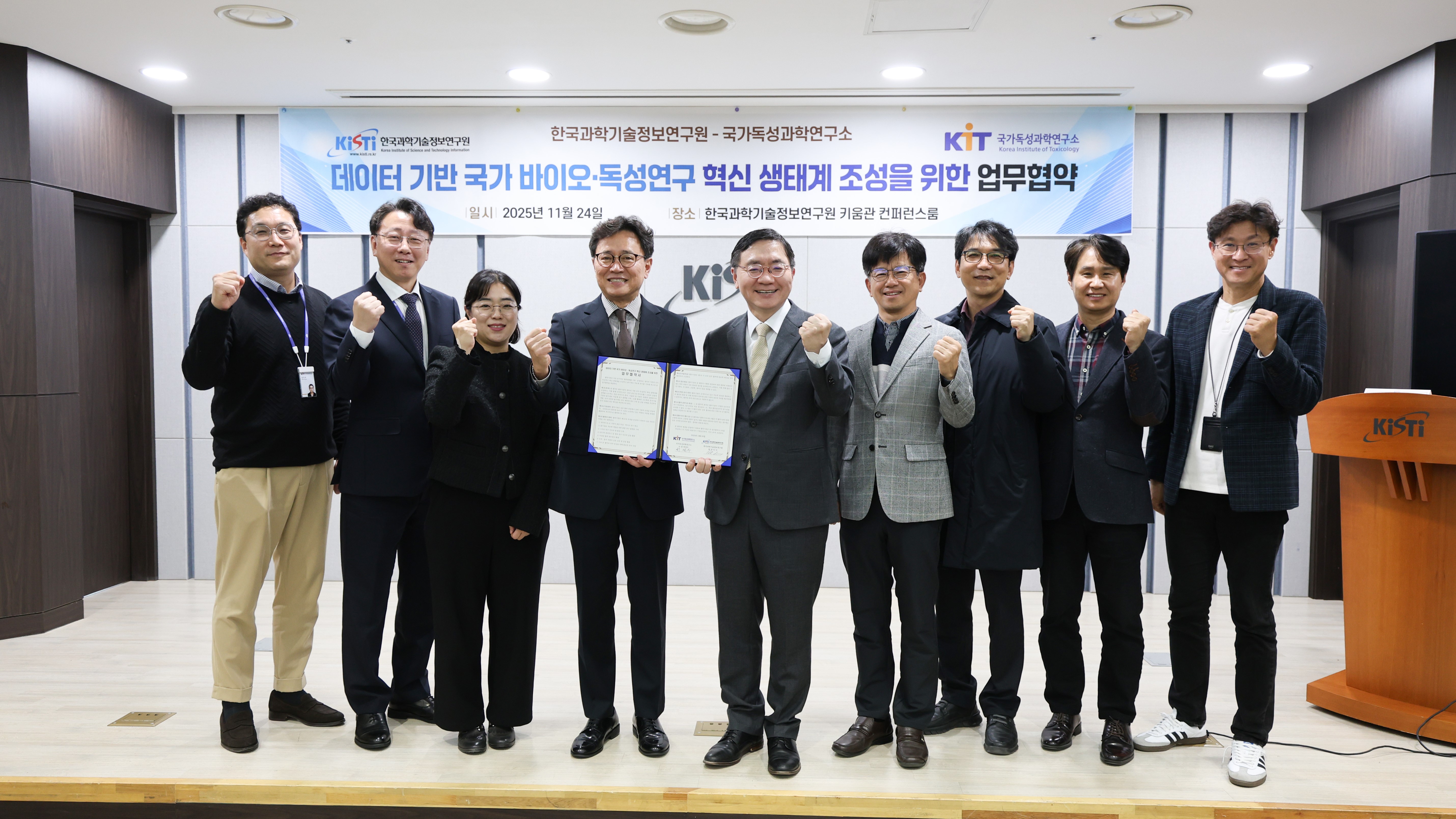 □ 한국과학기술정보연구원(원장 이식, 이하 KISTI)은 국가독성과학연구소(소장 허정두, 이하 KIT)와 11월 24일(월) KISTI 대전본원에서 '데이터 기반 국가 독성연구 생태계 조성 및 대용량 실험데이터 기반 줄기세포 치료제 연구 플랫폼 구축'을 위한 업무협약(MoU)을 체결했다고 밝혔다.