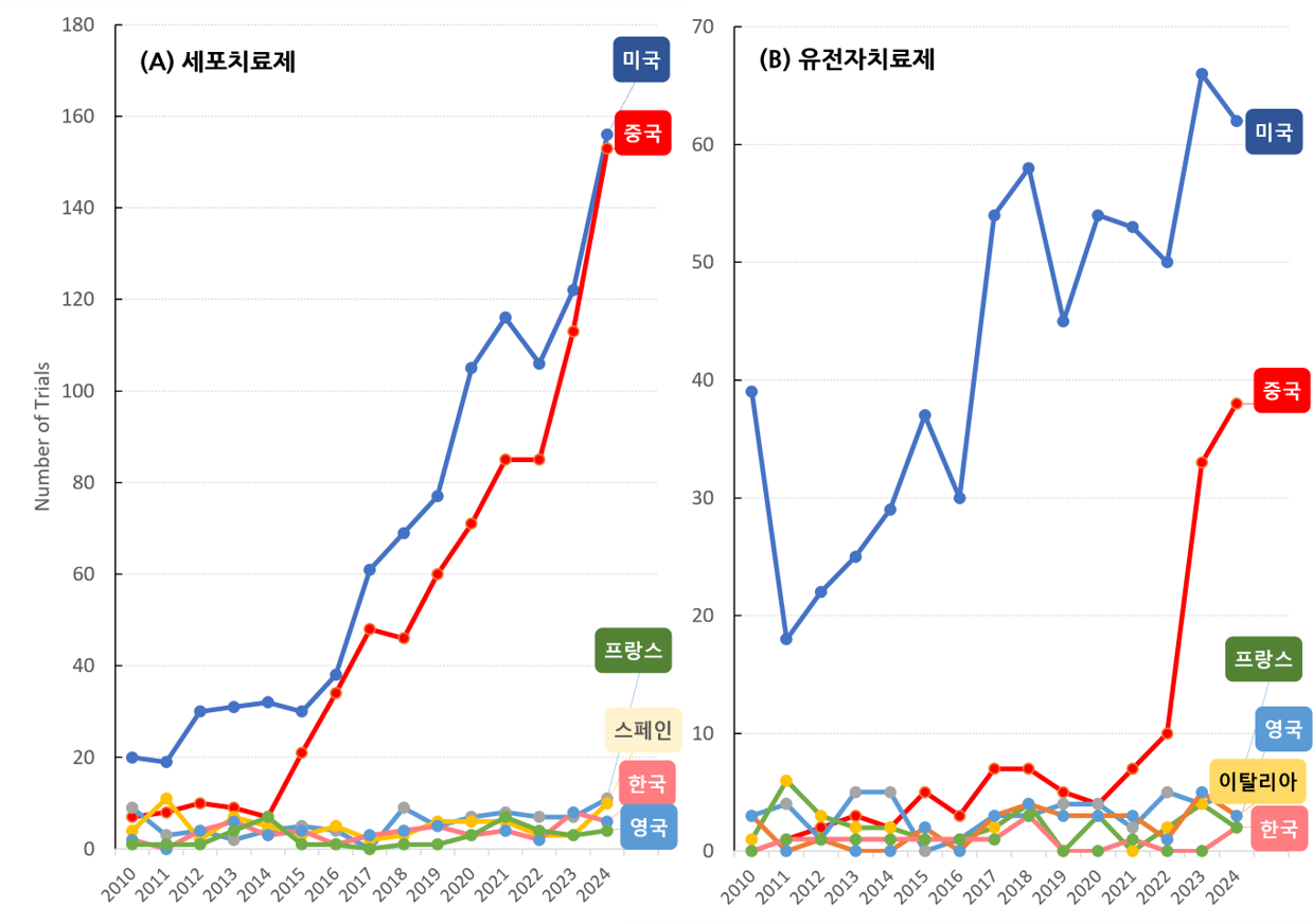 □ 국가별 연구 동향에서는 미국과 중국이 CGT 분야를 주도하는 가운데 양국 간 경쟁 구도가 한층 치열해지는 양상을 보였다. 미국은 유전자치료 임상 분야에서 선도적 위치를 유지하고 있으며, 중국은 대규모 투자와 정책 지원을 바탕으로 빠르게 추격하며 세포치료 분야에서 격차를 크게 좁힌 것으로 평가됐다.[그림 1]