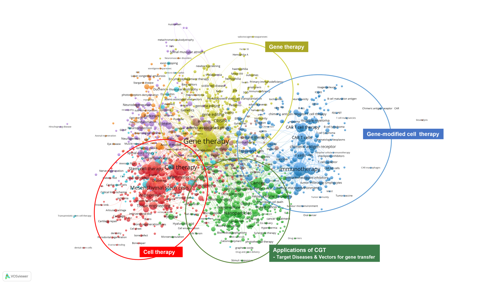 □ 연구 지형을 살펴보면,[그림 2] CGT는 기존 줄기세포 기반 치료에서 유전자 편집 기술 발전을 바탕으로 세포치료와 유전자치료가 융합되는 방향으로 진화하고 있는 것으로 나타났다. 또한 치료 대상은 기존 혈액암 중심에서 난소암, 자궁경부암 등 고형암으로 확대되고 있으며, 자가면역질환, 대사질환, 신경계 질환 등으로 적용 범위가 빠르게 확장되는 추세다.