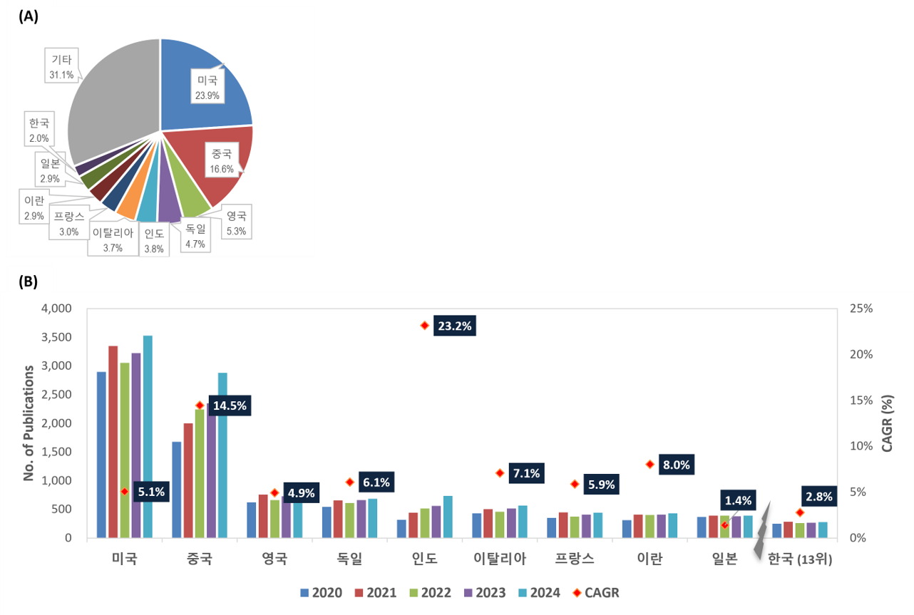 [그림 3] 주요국의 CGT 논문 점유율(A)과 발표 추이(B)