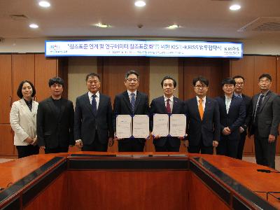 KISTI-KRISS, 연구데이터 참조표준화 위한 MOU 체결 - 참조표준의 DataON 연계·보급 및 연구데이터 참조표준화 - 한국과학기술정보연구원(원장 김재수, 이하 KISTI)은 한국표준과학연구원(원장 박현민, 이하 KRISS)과 4월 18일 KISTI 본원에서 참조표준의 DataON 연계·보급 및 연구데이터 참조표준화 관련 공동협력 협약식을 개최하고 MOU(업무협약)를 체결했다고 밝혔다. 이번 업무협약은 KRISS가 보유하고 있는 참조표준의 연계와 KISTI가 보유하고 있는 연구데이터의 참조표준화를 위한 상호협력을 목표로 하며 ▲국가연구데이터플랫폼 DataON*으로 참조표준 메타데이터를 연계·제공하기 위한 기술협력 및 상호 교류 ▲국가연구데이터플랫폼 DataON 내 국가 R&D 연구데이터의 참조표준 제정을 위한 기술협력 및 상호 교류 ▲ 과학기술 지식인프라의 공유·활용을 위한 연구 및 상호 교류 등을 주요 내용으로 한다. *DataON : KISTI가 구축·운영하는 국가연구데이터플랫폼서비스로 연구데이터의 체계적인 공유·관리와 검색·활용을 지원한다(dataon.re.kr). 이를 통해 KISTI가 운영하는 DataON에 KRISS의 참조표준을 연계하고 DataON의 연구데이터를 참조표준화하여 참조표준 보급체계를 확대함으로써 연구데이터의 정확도와 신뢰도를 한층 더 높일 것으로 기대된다. 김재수 KISTI 원장은 "KISTI가 데이터 기반 R&D를 지원하기 위해 구축하고 있는 연구데이터 공유·활용 체계에 정보의 신뢰성을 보장할 수 있는 참조표준 데이터를 함께 활용함으로써 연구개발 활동의 신뢰도 향상과 신기술 연구개발 지원에 기여할 것으로 기대한다"라고 전했다. 박현민 KRISS 원장은 “국가연구데이터플랫폼에 공인된 고품질 데이터인 참조표준을 연계한다면 참조표준 보급·유통이 확대될 것”이라며, “국가연구데이터플랫폼 연구데이터의 참조표준화 추진을 통해 연구데이터의 과학·기술적 정확도와 신뢰도를 높이길 바란다”라고 밝혔다.KISTI, 국방 무기체계 CBM+ 특화연구센터 개소식