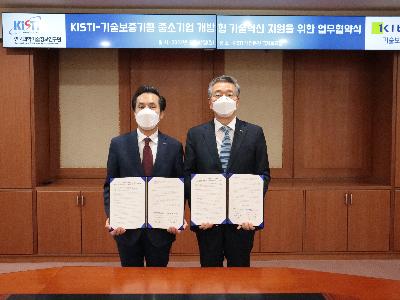 KISTI-기보, 중소기업의 R&D 활용 지원 위해 힘 합치다 - 중소기업의 R&D 성과 활용 통한 개방형 기술혁신 강화 - 한국과학기술정보연구원(이하 KISTI)과 기술보증기금(이하 기보)이 중소기업의 국가R&D 성과 활용을 통한 개방형 기술혁신을 강화하기 위해 힘을 합쳤다. 양 기관은 2일(월) KISTI 대전본원에서 KISTI 김재수 원장, 기보 김종호 이사장 등이 참석한 가운데 ‘KISTI-기술보증기금 간 중소기업 개방형 기술혁신 지원을 위한 업무협약(MOU)’을 체결했다. 이번 업무협약은 국가과학기술 정보와 기업 기술정보의 연계를 통해 R&D 보증 지원을 강화하고 R&D 기술이전, 기술 발굴 등 중소·벤처기업의 R&D역량 강화를 돕기 위해 마련됐다. 주요 협약 내용으로는 ▲KISTI 국가과학기술지식정보서비스(이하 NTIS)의 국가R&D 정보와 기보의 기술이전·사업화 및 기술금융 등 지원정보 공유 ▲중소기업 R&D역량 강화를 지원하기 위한 데이터 활용 방안 마련 ▲국가R&D 성과 활용·확산을 높이기 위한 데이터 활용 방안 마련 등으로 중소기업 기술혁신 지원 활성화를 위해 양 기관 모두 적극 협조하기로 했다. 이번 협약에 따라 KISTI는 기보의 기술이전·사업화 및 기술금융 등의 정보를 공유 받아 기술거래플랫폼의 공급기술 DB를 확보하고 수요기업의 R&D 수행 정보를 기반으로 기술이전·사업화를 지원할 계획이다. 그 뿐만 아니라 중소기업의 R&D 기획과 수행을 위한 기술·시장정보, 분석 모델을 제공하여 NTIS의 활용을 확대할 계획이다. 한편, 기보는 NTIS에서 수집 중인 국가R&D 정보를 제공 받아 R&D 사업화 보증 지원에 활용하고, 기업의 기술수요를 파악하여 개방형 기술혁신 지원에 활용할 계획이다. KISTI 김재수 원장은 “우리가 글로벌 과학기술 패권 경쟁에서 뒤쳐지지 않기 위해서는 경쟁력 있는 중소기업들이 많이 등장해야 한다”며, “KISTI가 보유한 방대한 국가과학기술 정보와 기보의 기업 기술정보의 만남이 중소기업의 R&D 기획 및 사업화 역량을 한 단계 끌어올리는 계기가 되고, 더 나아가 글로벌 기업으로 성장하는 발판이 될 것”이라고 강조했다.KISTI, 중소기업 디지털 전환(DX) 지원전략 제언